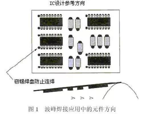分布在焊接面的元器件,引脚的方向宜垂直于波峰焊接时PCB的传送方向,以保证元器件两边的焊端或引线同时被浸焊,相邻元件间的排列次序和间距也应满足波峰焊接的要求以避免“遮蔽效应”,如图1。当采用波峰焊接SOIC等多脚元件时,应于锡流方向最后两个(每边各1)焊脚处设置窃锡焊盘,防止连焊。