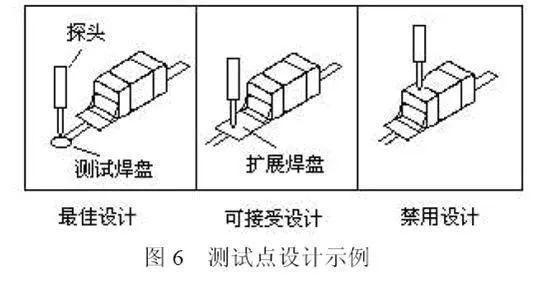 通过延伸线在元器件引线附近设置测试焊盘或利用过孔焊盘测试节点,测试节点严禁选在元器件的焊点上,这种测试可能使虚焊节点在探针压力作用下挤压到理想位置,从而使虚焊故障被掩盖,发生所谓的“故障遮蔽效应”。